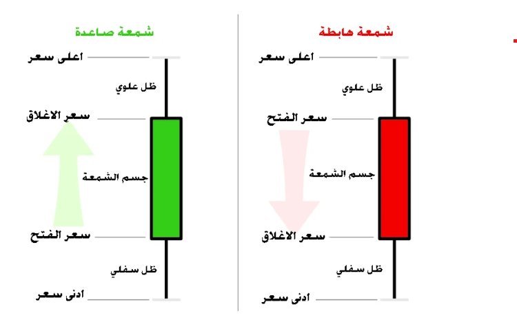 • تحديد نوع الشمعة: لابد من معرفة إن كانت الشمعة صاعدة أم هابطة، فالصاعدة عادةً تحمل اللون الأخضر في دلالة على ارتفاع السعر، والهابطة غالبًا ما تحمل اللون الأحمر وتيشر لانخفاض السعر.