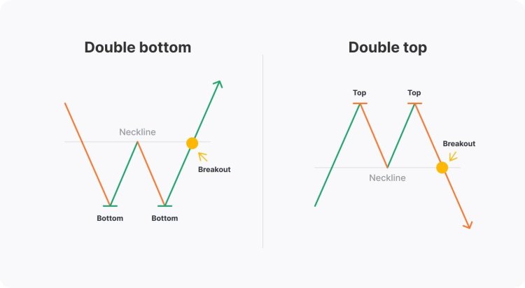 الفرق الأساسي بين نموذج القاع المزدوج (Double Bottom) ونموذج القمة المزدوجة (Double Top) يكمن في نوع الانعكاس الذي يشيران إليه، حيث يمثلان اتجاهين متعاكسين.